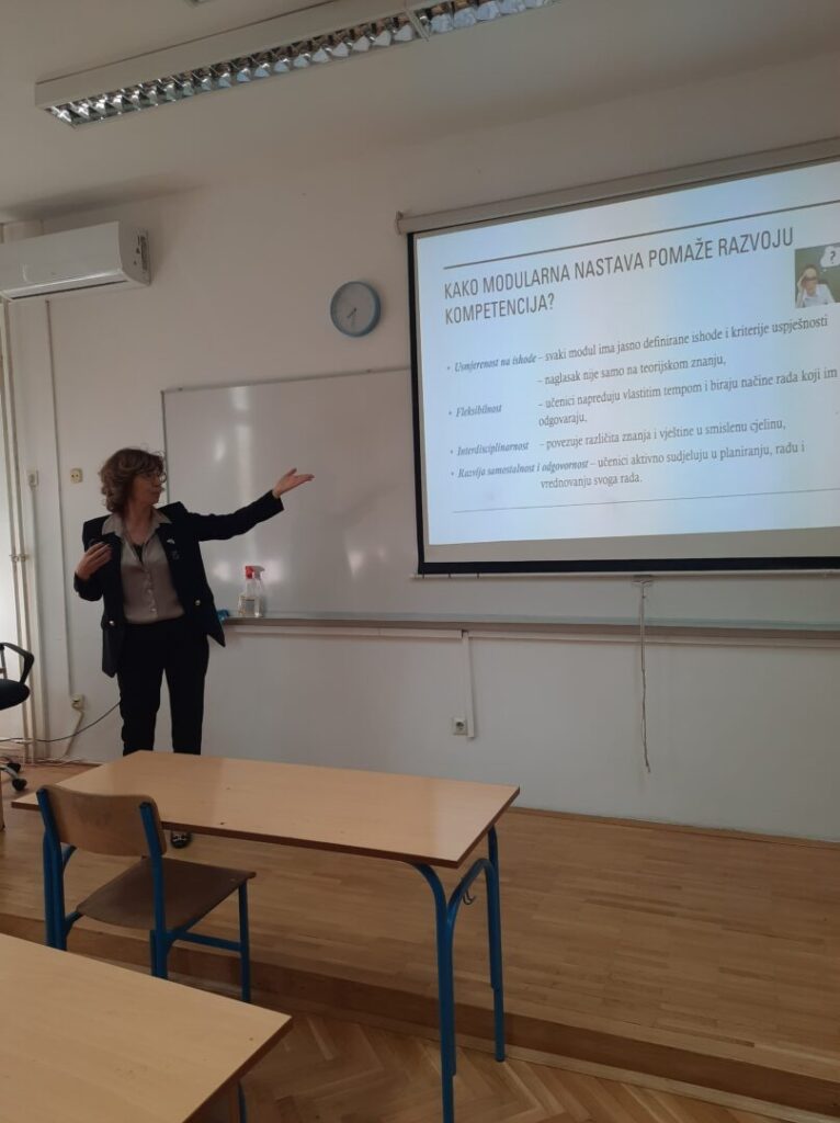 Nakon uvodnog izlaganja i objašnjenja na koji način modularna nastava pomaže razvoju kompetencija i povezuje različita znanja i vještine u smislenu cjelinu, te kako primijeniti različite metode i tehnike praćenja, vrednovanja i ocjenjivanja u modularnoj nastavi održana je i radionica.