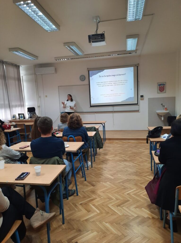 Nakon predavanja gospođe Maje Knežević, mag.iur. iz PRONI, Info centra za mlade Osijek o različitim oblicima suradnje i iskustvima škola koja surađuju s Info centrom za mlade, te aktivnostima koje pospješuju životne vještine i konkurentnost na tržištu rada razmijenili smo kontakte. I ovaj puta naglasak je bio na važnosti prirodnih resursa u okviru koncepta održivog razvoja. Europske snage solidarnosti su još jedan vid aktivnosti koje nam pružaju Europske politike za mlade, a mnogima se još uvijek čine nestvarnim.