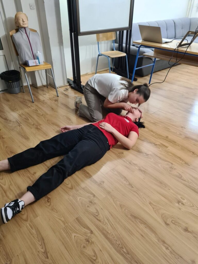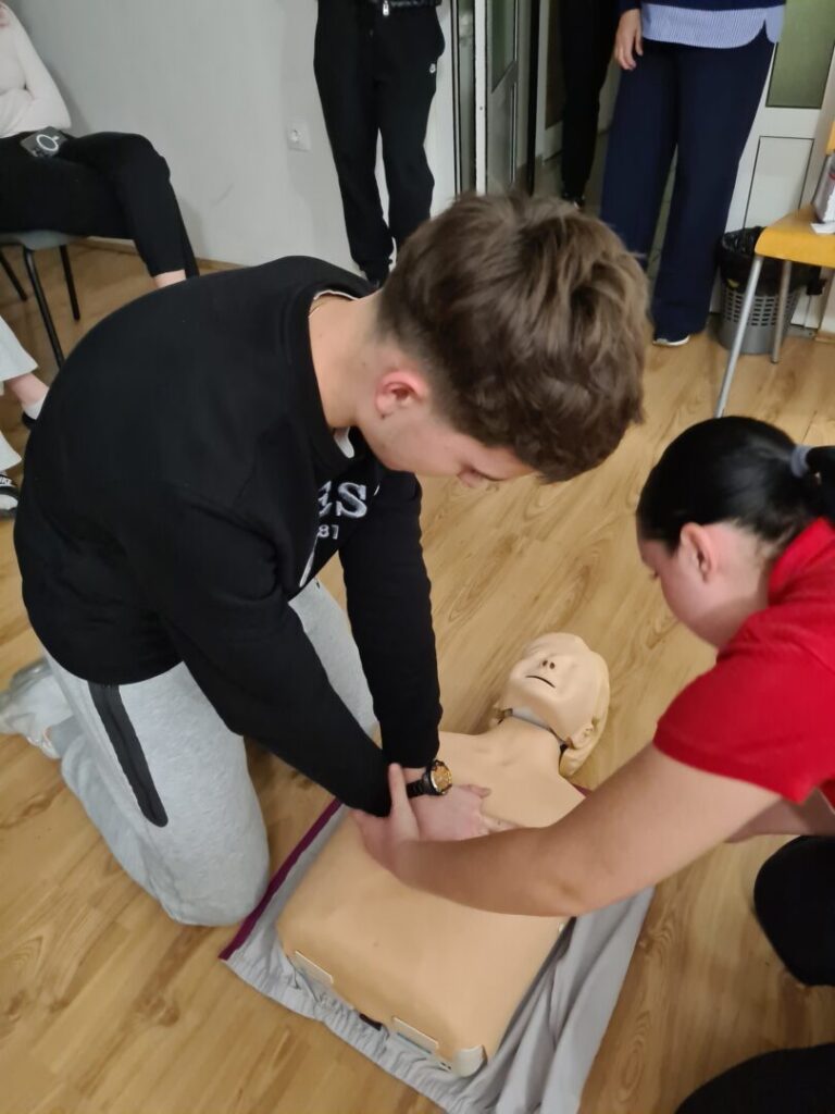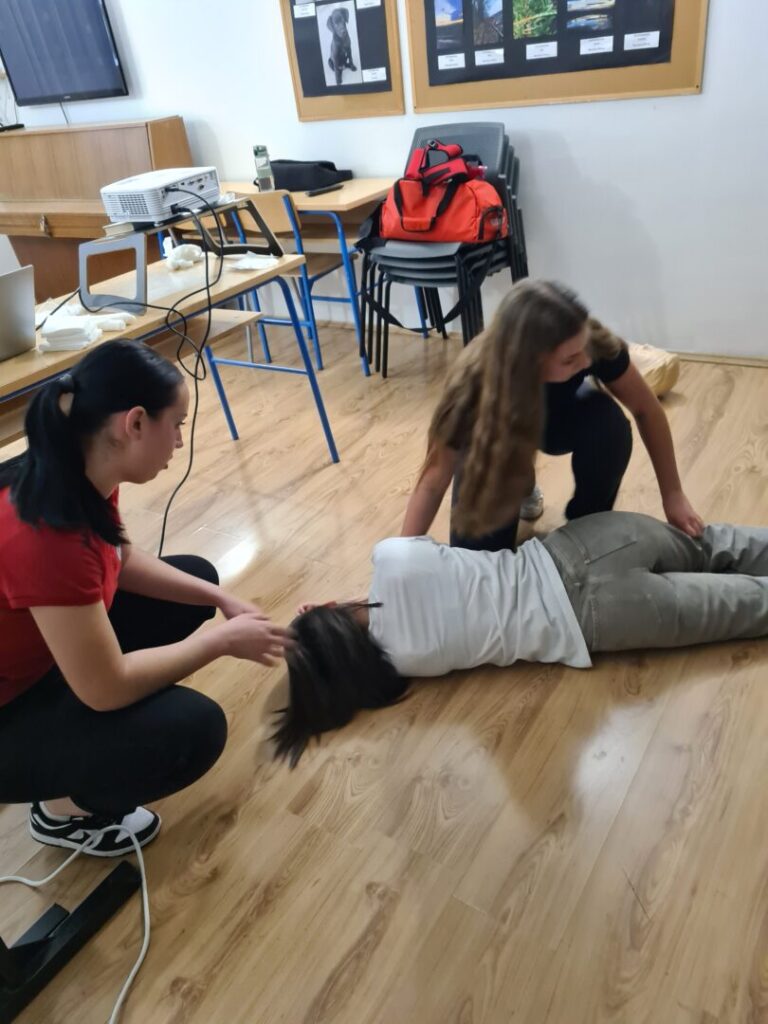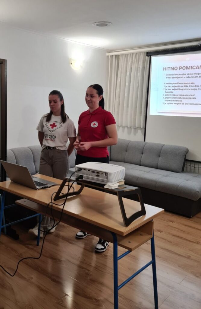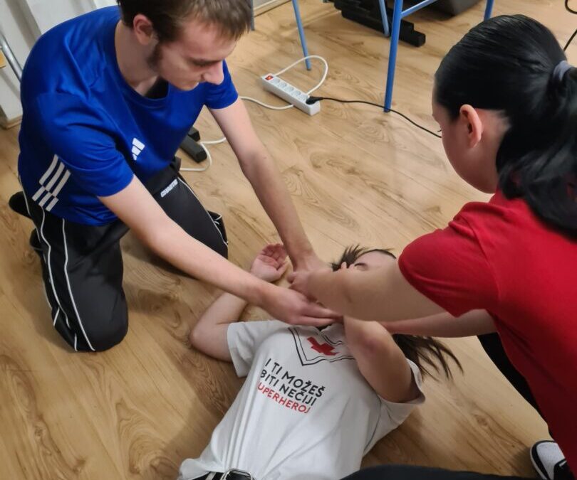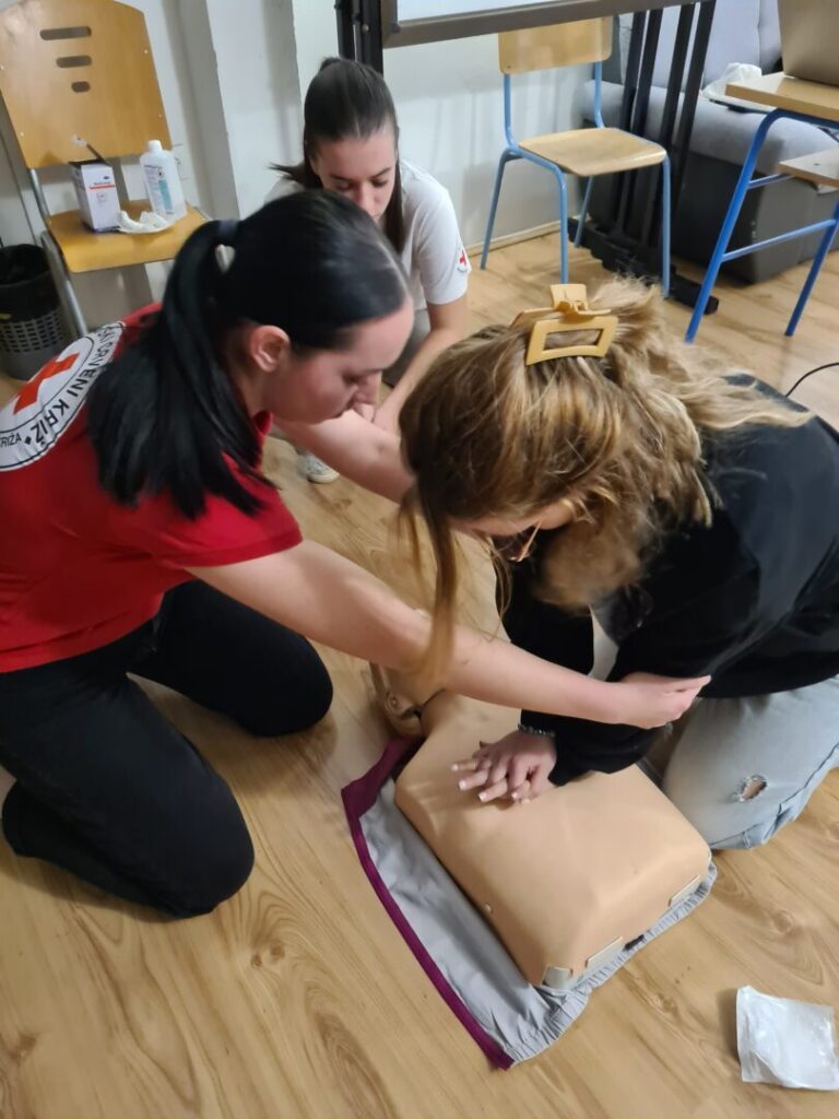 Prva pomoć je odmah pružena pomoć osobi koja je povrijeđena ili iznenada oboljela prije dolaska liječnika ili hitne pomoći. Postoji nekoliko osnovnih zahvata prve pomoći (zaustavljanje krvarenja, oživljavanje, imobilizacija prijeloma, postavljanje osoba u sigurnu bočnu poziciju, hlađenje opeklina), a to su nam zorno, nakon prezentacije, pokazale Anja Perić i Marija Lorena Takač aktivne članice Crvenog križa i učenice Učeničkog doma Trgovačke i komercijalne škole „Davor Milas“ Osijek. Učenike su animirale i organizirale izvedbu radionice, Sonja Grahovac, prof. i Kristina Jurić, prof. Sve potrebne lutke, gaze i ostala pomagala su iz Crvenog križa Osijek.