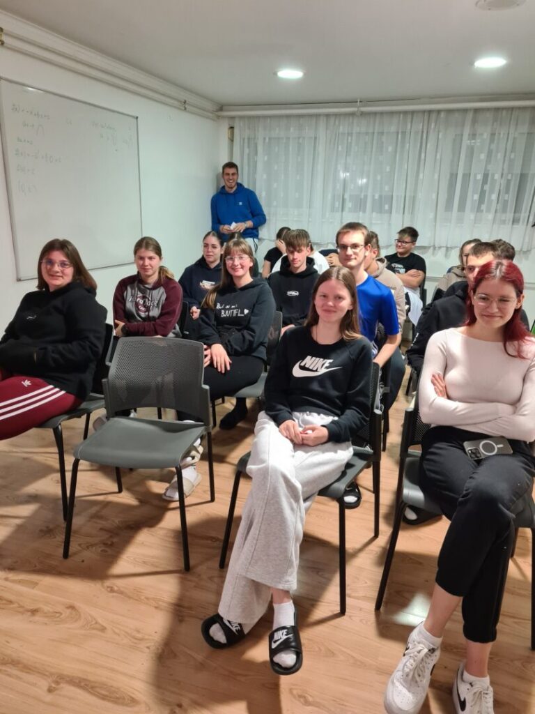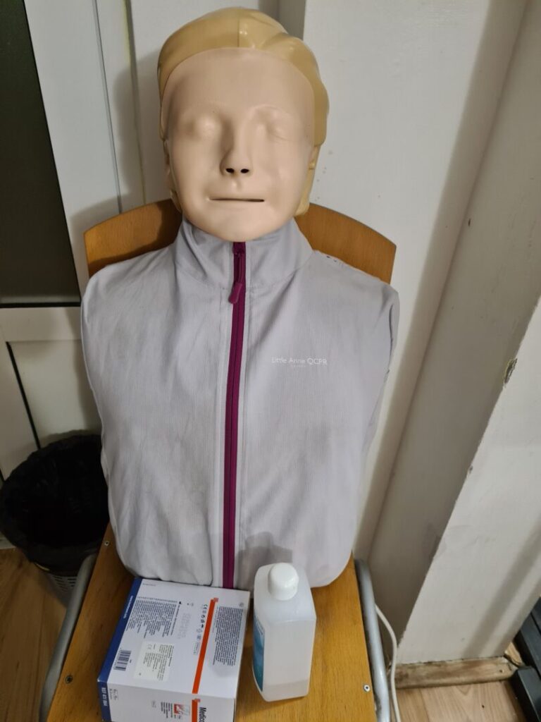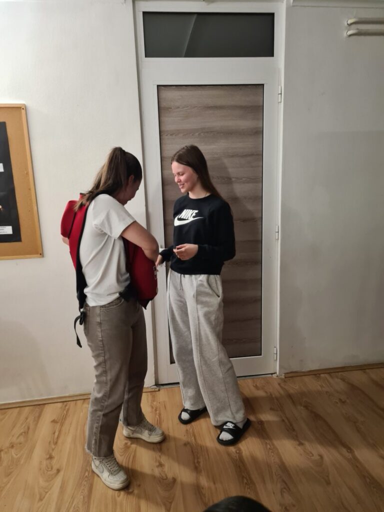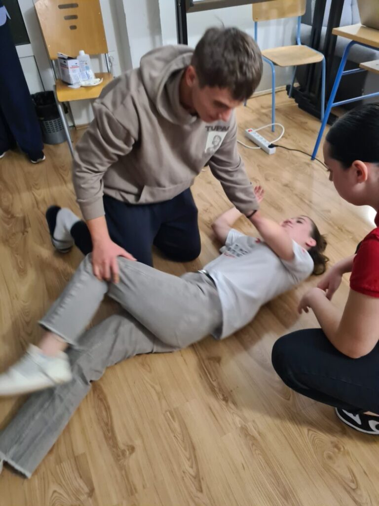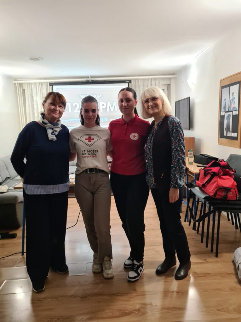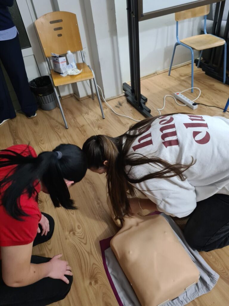 Prva pomoć je odmah pružena pomoć osobi koja je povrijeđena ili iznenada oboljela prije dolaska liječnika ili hitne pomoći. Postoji nekoliko osnovnih zahvata prve pomoći (zaustavljanje krvarenja, oživljavanje, imobilizacija prijeloma, postavljanje osoba u sigurnu bočnu poziciju, hlađenje opeklina), a to su nam zorno, nakon prezentacije, pokazale Anja Perić i Marija Lorena Takač aktivne članice Crvenog križa i učenice Učeničkog doma Trgovačke i komercijalne škole „Davor Milas“ Osijek. Učenike su animirale i organizirale izvedbu radionice, Sonja Grahovac, prof. i Kristina Jurić, prof. Sve potrebne lutke, gaze i ostala pomagala su iz Crvenog križa Osijek.